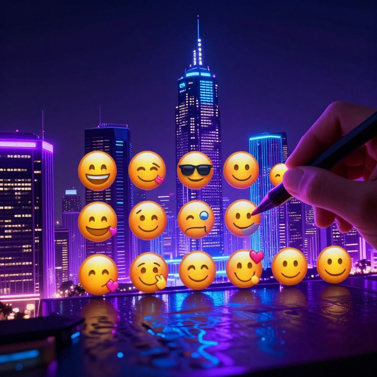 Photograph of a nighttime cityscape featuring a skyline of brightly lit skyscrapers with neon blue and purple lights. In the foreground, a hand with a pen is drawing a heart on an orange, yellow smiley face emoji. Eleven other orange smiley face emojis with various expressions (winking, sunglasses, sad, confused, heart, etc.) are arranged in a grid on a reflective surface. The towering buildings include a prominent, illuminated spire in the background. The image has a vibrant, digital, and modern feel, with a focus on contrasting bright emojis against the dark, illuminated cityscape.