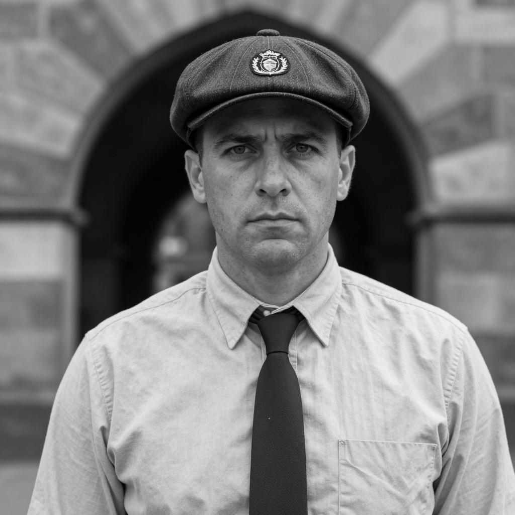 Black and white photograph of a man with light skin and short hair wearing a flat cap with a crest, light-colored button-up shirt, and dark tie. He has a serious expression. Background includes an arched stone structure and dark tunnel entrance. He is centered, facing forward.