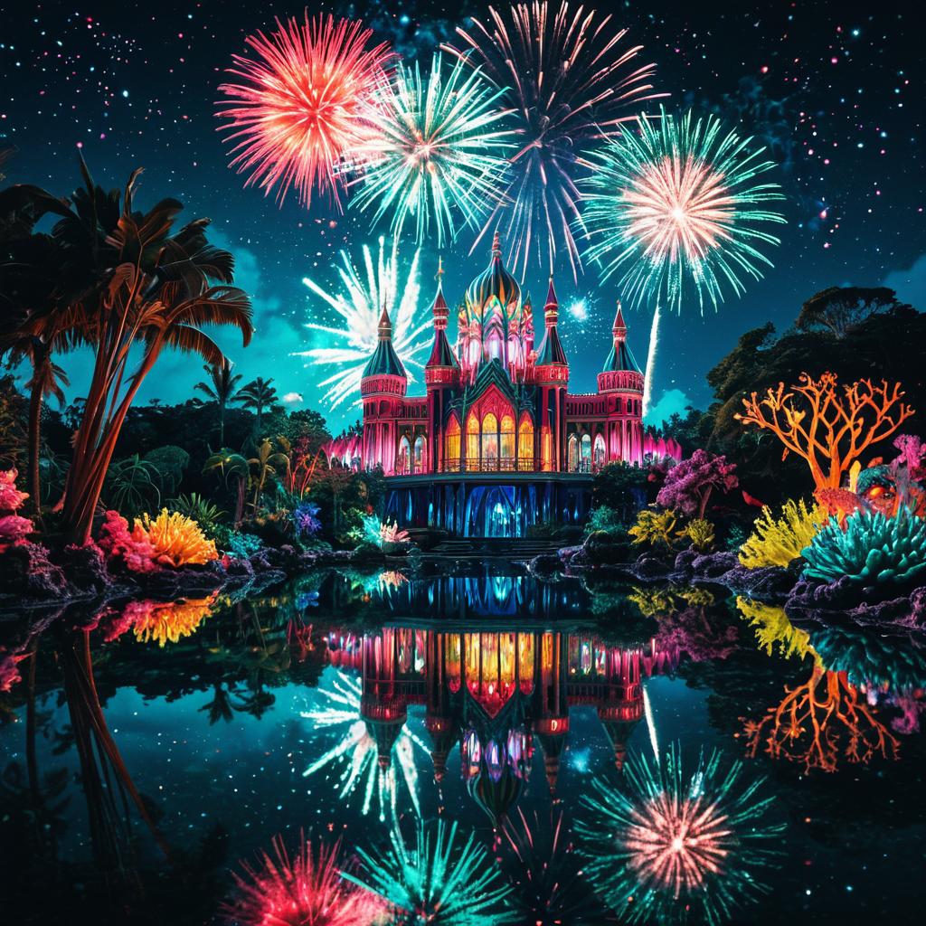 A vibrant and colorful fairy-tale style crystal palace illuminated at nighttime, surrounded by luminescent coral reefs and tall, glowing trees. Bright, multicolored fireworks explode in the starry sky, their bursts beautifully reflected on a mirror-like lagoon in front of the palace, creating a magical and peaceful atmosphere.
