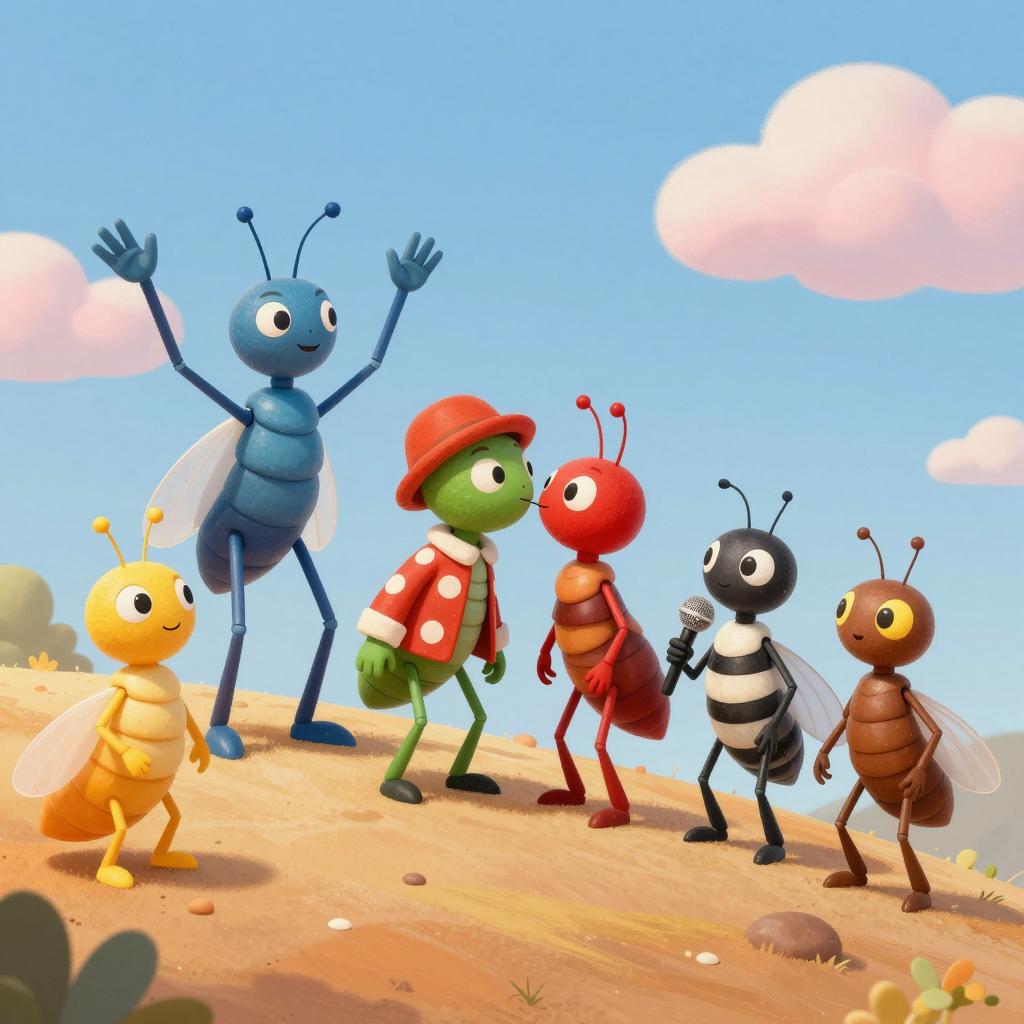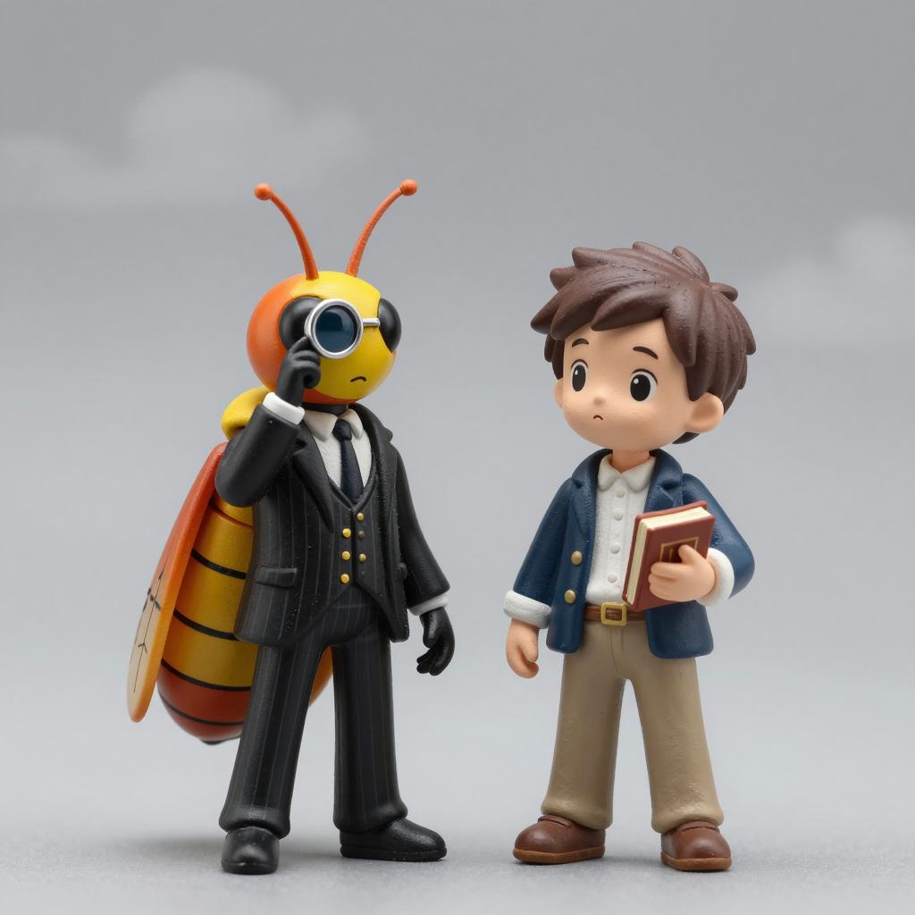 Photograph of two detailed, painted figurines against a cloudy sky background. The left figurine is an anthropomorphic insect with orange and yellow exoskeleton, wearing a black pinstripe suit, holding a monocle to its right eye. The right figurine is a small human boy with brown hair, wearing a dark blue jacket and beige pants, holding a small book with a building cover. The boy has a surprised expression, while the insect has a focused expression. Both figurines are positioned close together, facing slightly to the right.