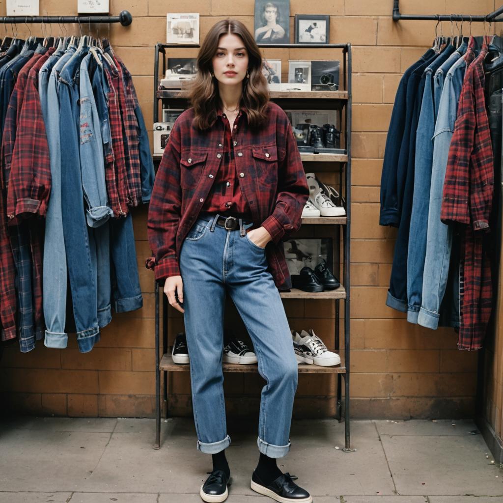 Photo of a Slender woman, Long Wavy, 90s outfit, baggy skinny jeans in Deep Red, oversized flannel shirt in Denim, graphic t-shirt, denim jacket, leather ballet flats, grunge style, plaid patterns, muted colors, casual, vintage, retro, 1990s fashion, Vintage Store, muted colors