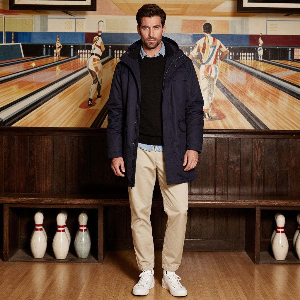 A man, navy blue parka jacket, beige tapered jogger trousers, black crew neck sweater, white high-top sneakers, denim shirt underneath, vintage bowling pins, dark wood paneling, vibrant murals of classic bowlers, sepia effect, focused expression. Man has masculine face and piercing eyes