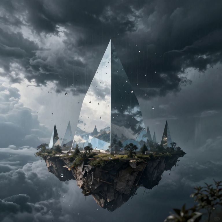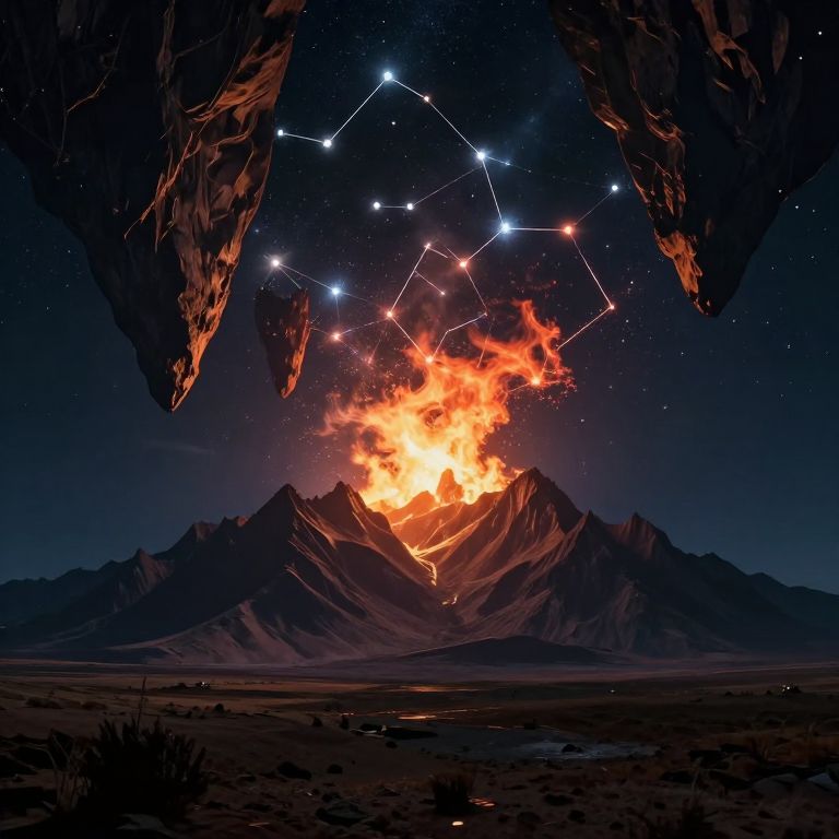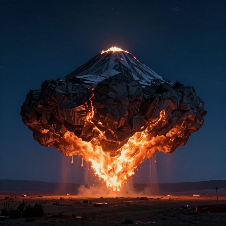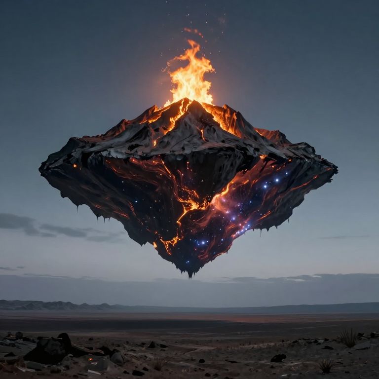 Suspended between earth and sky, the inverted mountain cradles a cosmic flame, casting a surreal glow over a desolate landscape, where solitude whispers of existential wonder and the eternal dance of creation and destruction.