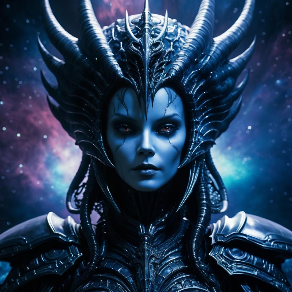 Close-up portrait of an alien queen featuring a menacing gaze, intricate biomechanical headgear, and dark metallic armor. The face is pale with sharp shadowing, and the background shows a cosmic outer space nebula. The image is inspired by H.R. Giger and Frank Frazetta styles with cinematic lighting by James Gurney.