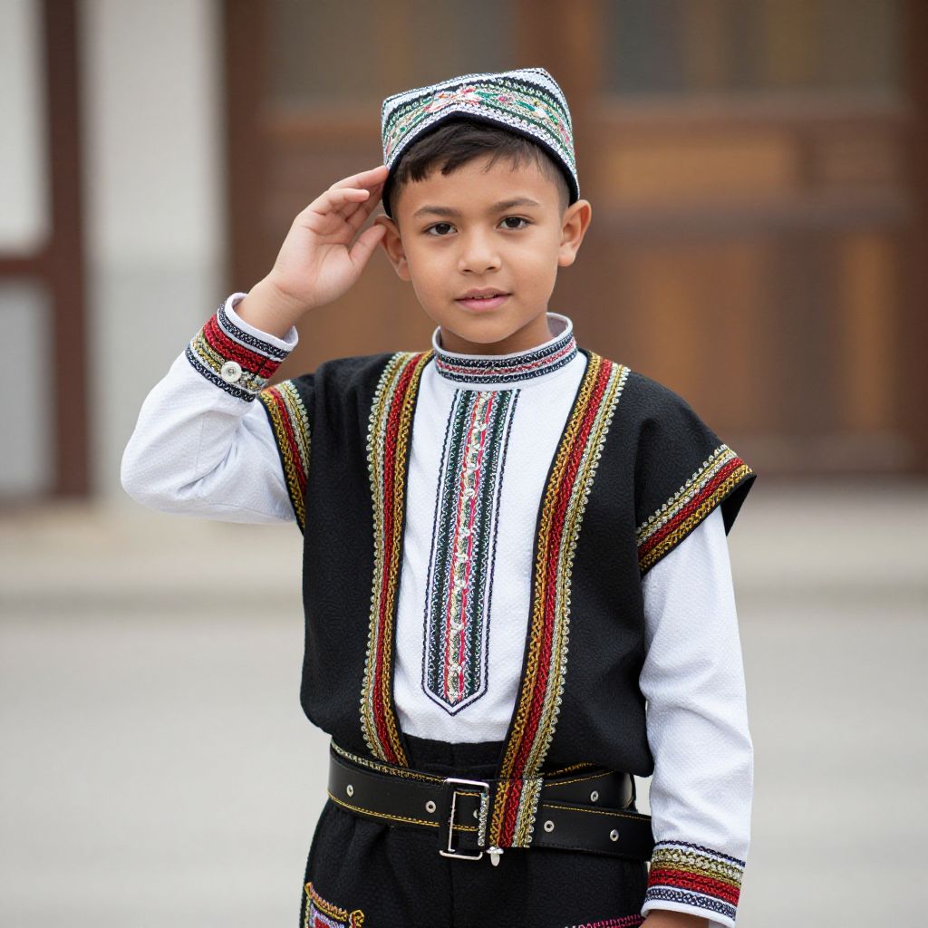 National Costume Boy, boy in traditional clothing and hat posing for a picture