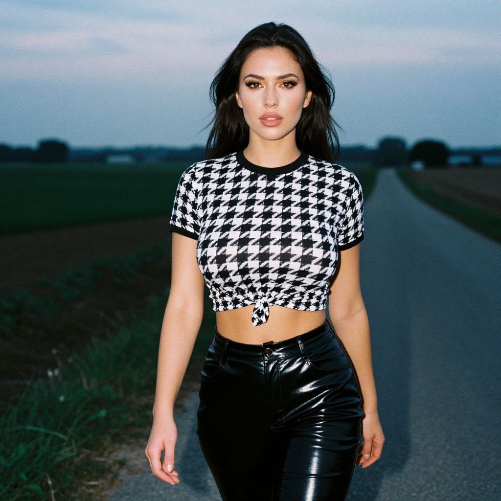 Photograph of a young woman with long, dark brown hair and light olive skin standing on a rural road at dusk. She wears a black and white houndstooth crop top tied at the front, revealing her toned midriff, and high-waisted, shiny black leather pants. Her makeup is bold with dark eyeliner and nude lipstick. The background shows a blurred, grassy field and a dimly lit sky. The image has a slightly exaggerated, almost hyper-realistic filter, giving it a surreal, digital enhancement.