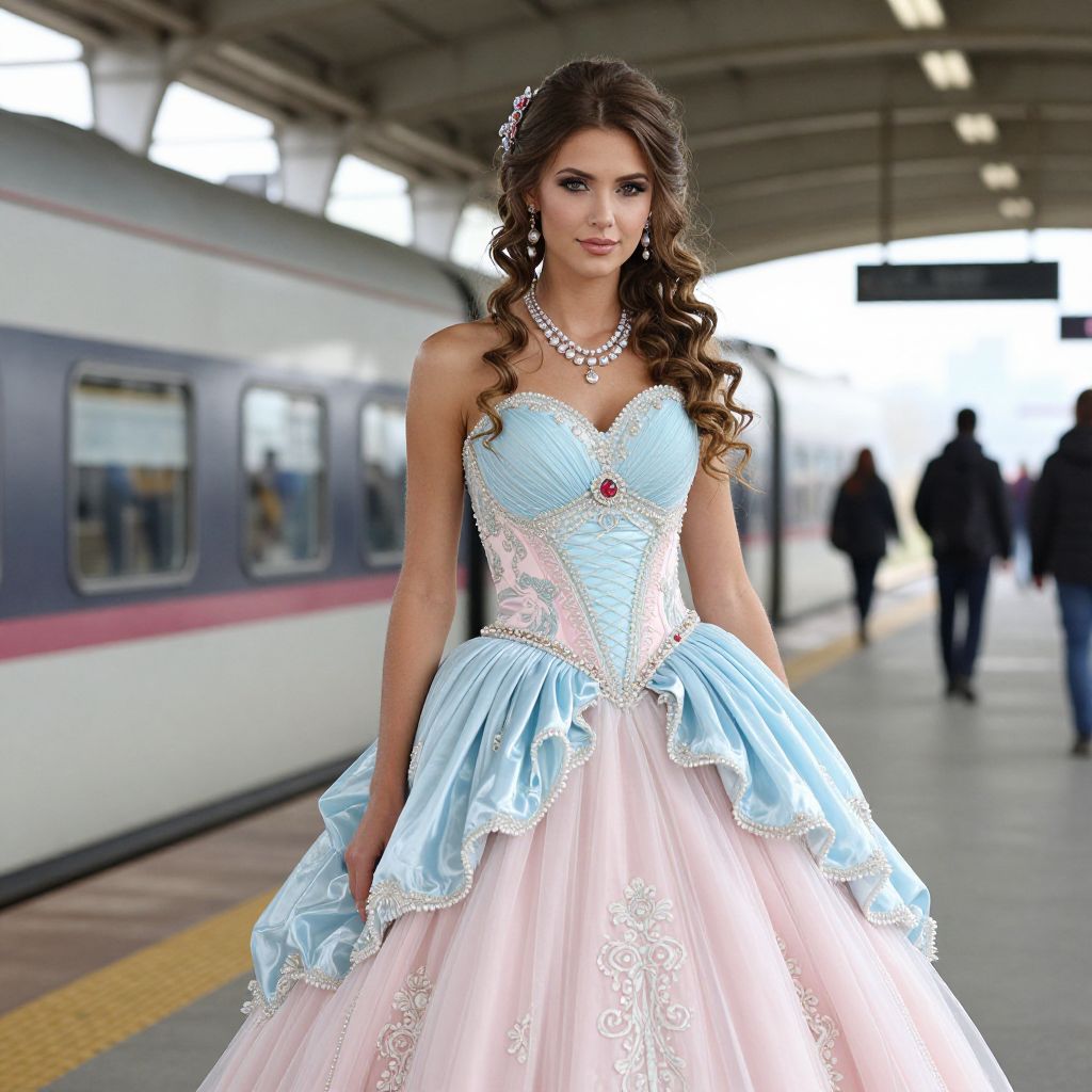 Photograph of a young woman with long, wavy brown hair standing on a train platform. She wears an elaborate, strapless ball gown with a sweetheart neckline, featuring light blue and pink fabric. The bodice is adorned with white lace and a red gemstone brooch, while the skirt has ruffled, layered layers. She accessorizes with a pearl necklace and earrings. In the background, a blue and white train with pink stripes is parked, and several blurred figures walk on the platform. The platform has yellow safety tiles and overhead lighting. The overall style is fairy tale-like and elegant.