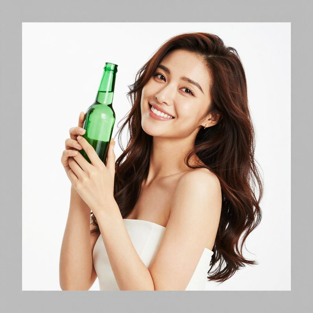 Photograph of a smiling woman with long, wavy brown hair, wearing a white strapless top, holding a green glass bottle with both hands. She's positioned slightly to the right, looking up and smiling at the camera. The background is a bright white, making her and the bottle stand out clearly. The image has gray borders on the top and bottom.
