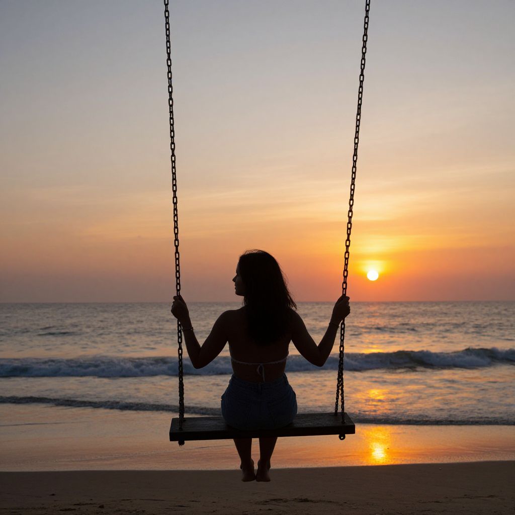 Silhouetted against the vibrant hues of a setting sun, a woman sits on a wooden swing suspended by chains, her back turned as she gazes out over the tranquil ocean waves rolling onto the sandy shore.