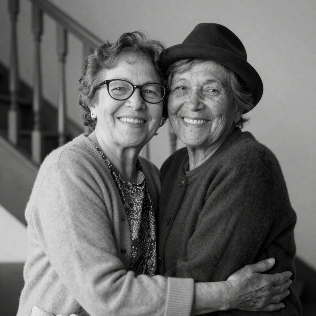 Photograph of an elderly man and a middle-aged woman standing in a doorway. The man has white hair, glasses, a brown jacket, and a striped scarf. The woman has wet, short brown hair, wearing a floral shirt. The man's arm is around the woman's shoulders. Both have slight smiles. Dark doorway background.