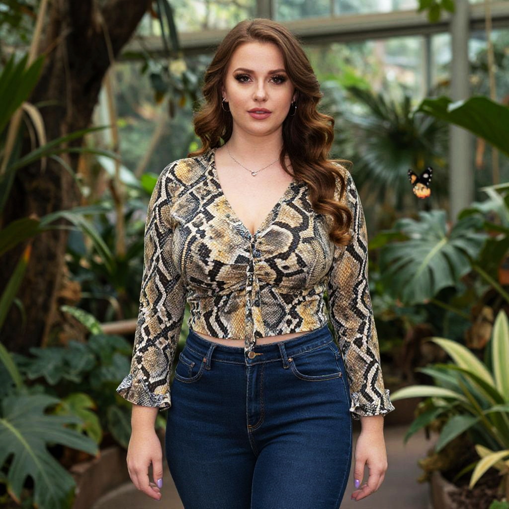 Photograph of a Caucasian woman with fair skin and long, wavy brown hair standing in a lush, tropical greenhouse. She wears a fitted, long-sleeved, snake-print blouse with a deep V-neck and dark blue high-waisted jeans. Her makeup is subtle with pink lipstick. She has a medium build with medium-sized breasts. The background is filled with large green plants and foliage, with sunlight filtering through the glass ceiling. She stands confidently, looking directly at the camera. The image has a slightly exaggerated, hyper-realistic style.