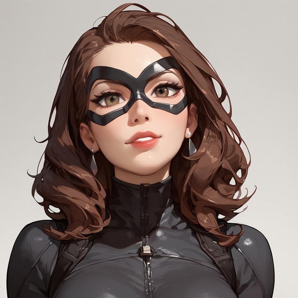 Score_9, score_8_up, score_7_up, score_6_up, score_5_up, score_4_up, , source_anime, 1girl, portrait of helenparr, brown hair, brown eyes, domino mask, bodysuit, upper body, smile