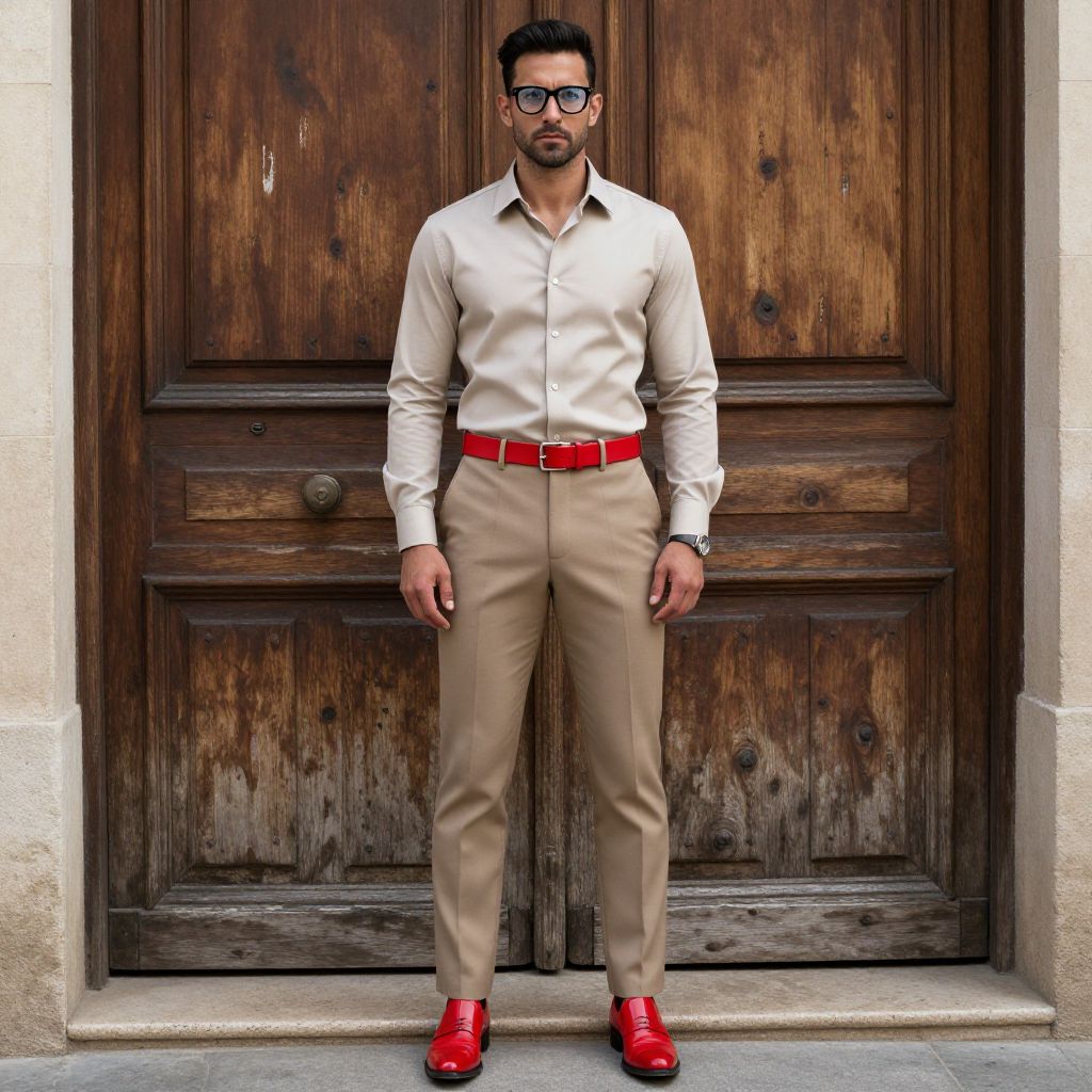 A handsome man wearing stylish glasses, a beige shirt, a vibrant red belt, and striking red shoes. He is standing confidently in front of a weathered, rustic wooden door, exuding a cool and sophisticated vibe.