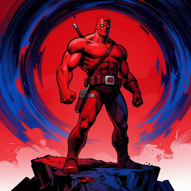 This digital comic-style illustration features a muscular, bald, red-skinned man with a stern expression, standing on a jagged rock. He has a sword sheathed on his back and wears black pants, a belt with a silver buckle, and black boots. A black strap crosses his chest. His right hand is clenched into a fist, and his left hand rests on his hip. The background is a vibrant mix of red, blue, and white, with a large, swirling, red circular pattern behind him. The image uses bold, contrasting colors and dynamic lines, evoking a dramatic, intense atmosphere.