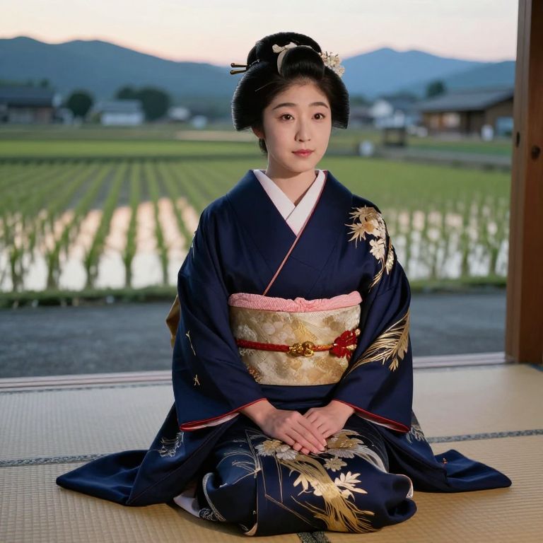 Photograph of an East Asian woman with fair skin and black hair styled in an updo, wearing a traditional navy blue kimono adorned with gold and white floral patterns, and a red and gold obi belt. She sits gracefully on a tatami mat floor, hands resting on her lap. The background showcases a serene rural landscape with a reflective rice paddy field, green hills, and traditional Japanese buildings. The sky is a soft gradient of pink and blue, indicating either dawn or dusk. The woman's calm expression and poised demeanor exude elegance and cultural authenticity.