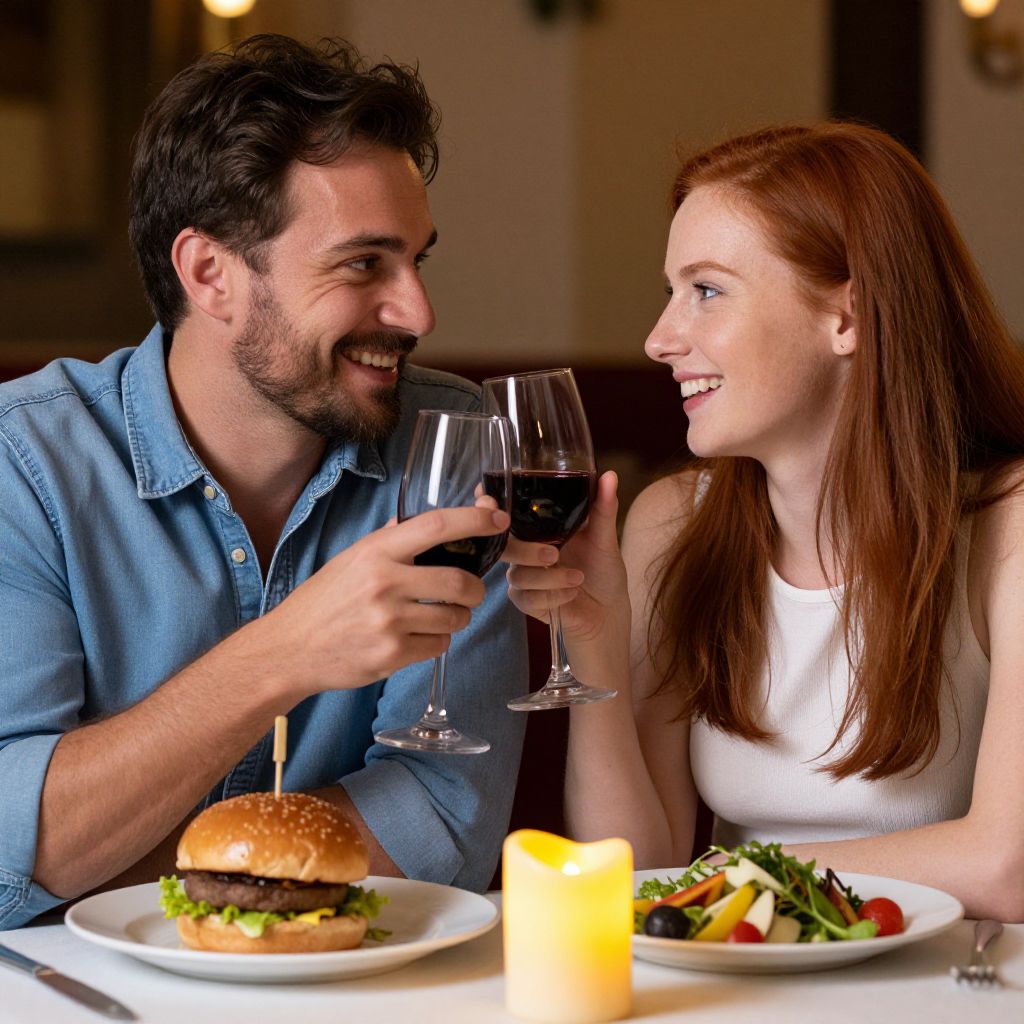 Photograph of a smiling couple sitting at a restaurant table. The man, with dark brown hair and beard, wears a blue shirt and raises a glass of red wine to the woman, who has long red hair and wears a white top. In front of them, there's a burger, a salad, and a glowing yellow candle. They're both looking at each other, enjoying a romantic moment.