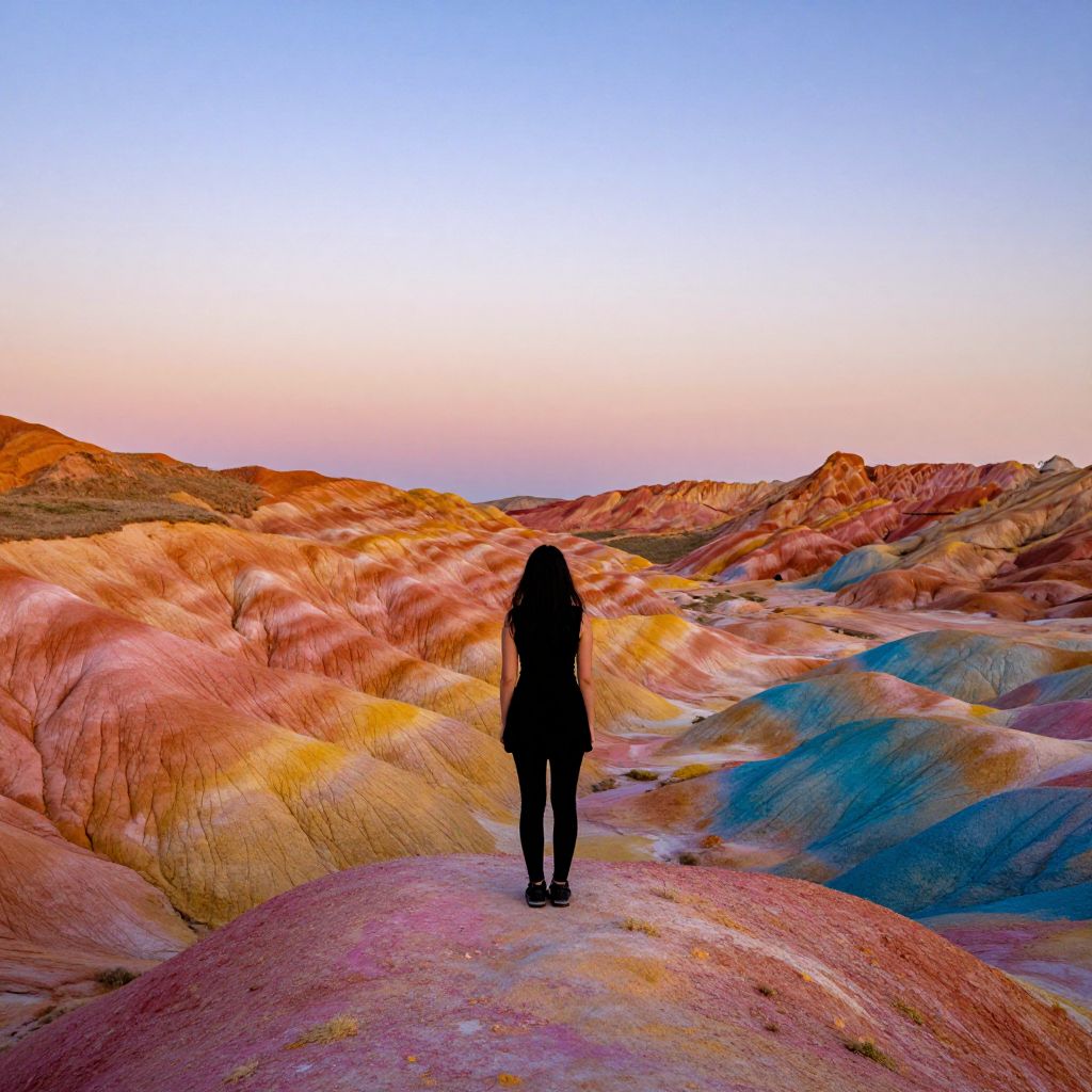 Photograph of a silhouetted woman with long hair standing in a vast, colorful desert landscape at sunset. She wears a black outfit and stands on a pink, ridge-like formation. The surrounding terrain is adorned with vibrant, multi-hued textures in shades of orange, red, pink, and blue, creating a mesmerizing, otherworldly scene. The sky above is a gradient of soft blue to pale pink, enhancing the surreal beauty of the landscape. The woman is positioned centrally, facing away from the camera, adding a sense of solitude and contemplation to the image.