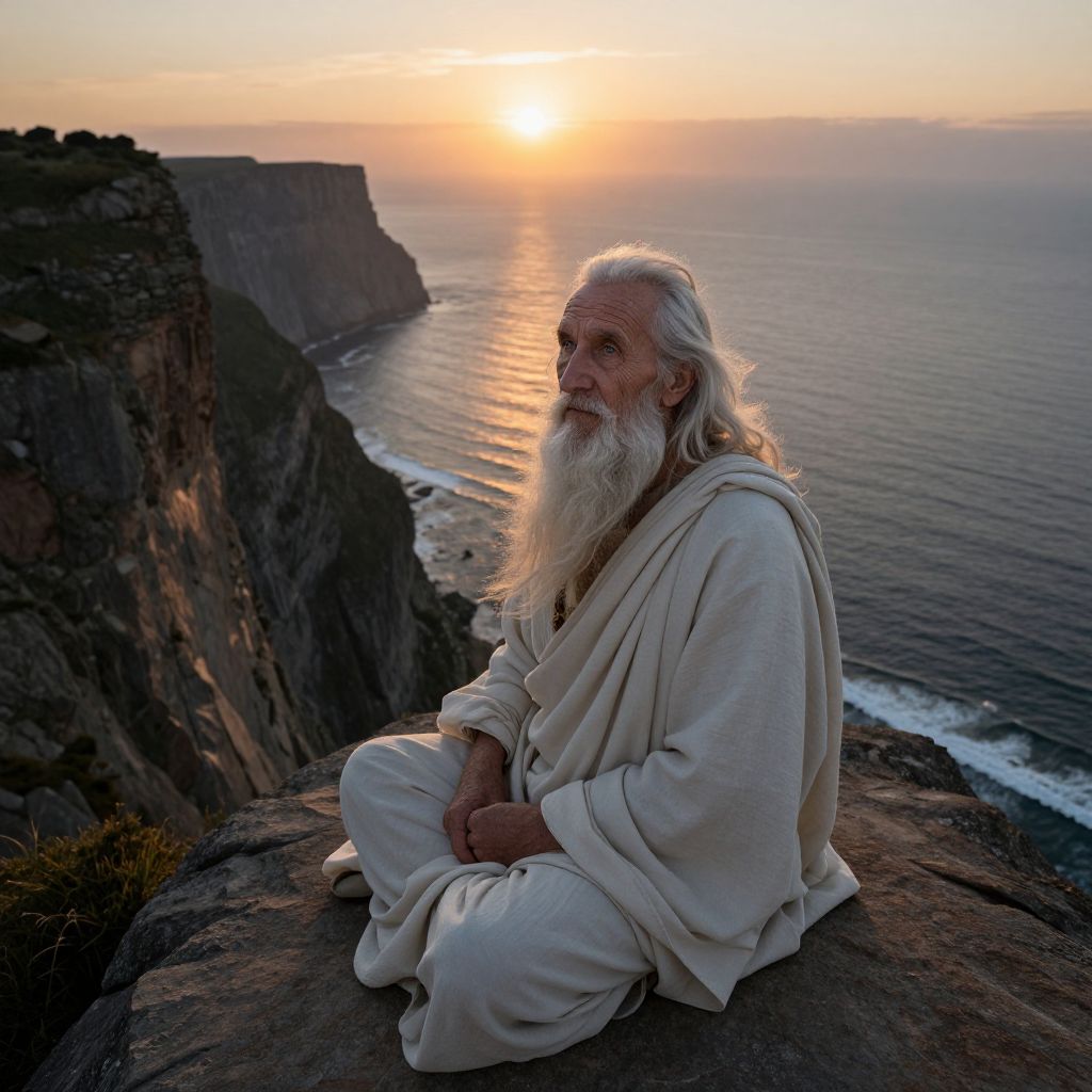 Photograph of an elderly man with a long, white beard and long white hair, sitting on a rocky cliff at sunset. He wears a loose, white, flowing robe. His gaze is directed toward the horizon where the sun is setting, casting a golden glow over the ocean and cliffs. The cliff to his left is dark and rugged, contrasting with the serene, reflective ocean waves. His expression is contemplative, and the soft light highlights the texture of his robe and the wisps of his hair. The overall mood is peaceful and introspective.
