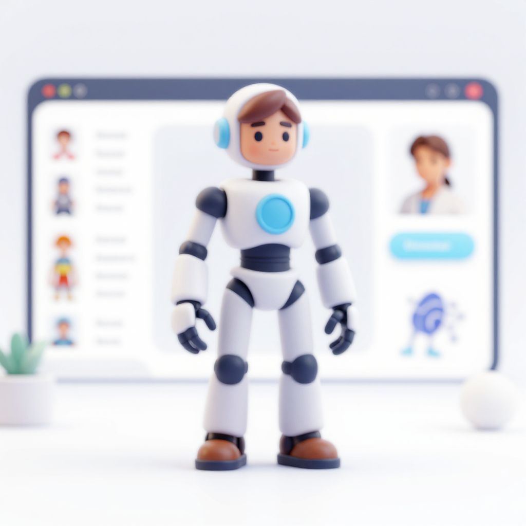 Create your own 3d character free using an intuitive user interface, with options for robot, fantasy, and human avatars, rendered in a clean, modern style with bright colors and a minimalist digital workspace background.