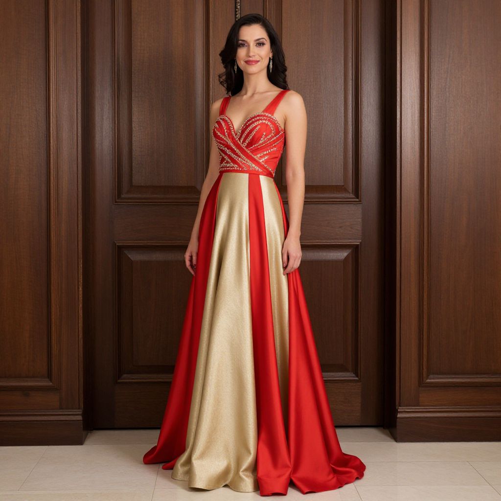 Photograph of a woman standing in front of dark wooden double doors. She has long, wavy black hair and wears a sleeveless, floor-length evening gown with a red bodice adorned with sparkling, intricate silver patterns, and a gold skirt. The dress has a fitted bodice and flares out at the waist, creating a elegant, flowing silhouette. Her makeup is subtle, enhancing her natural features. The floor is tiled in white, contrasting with the rich, dark wood of the doors. The overall style is formal and glamorous.