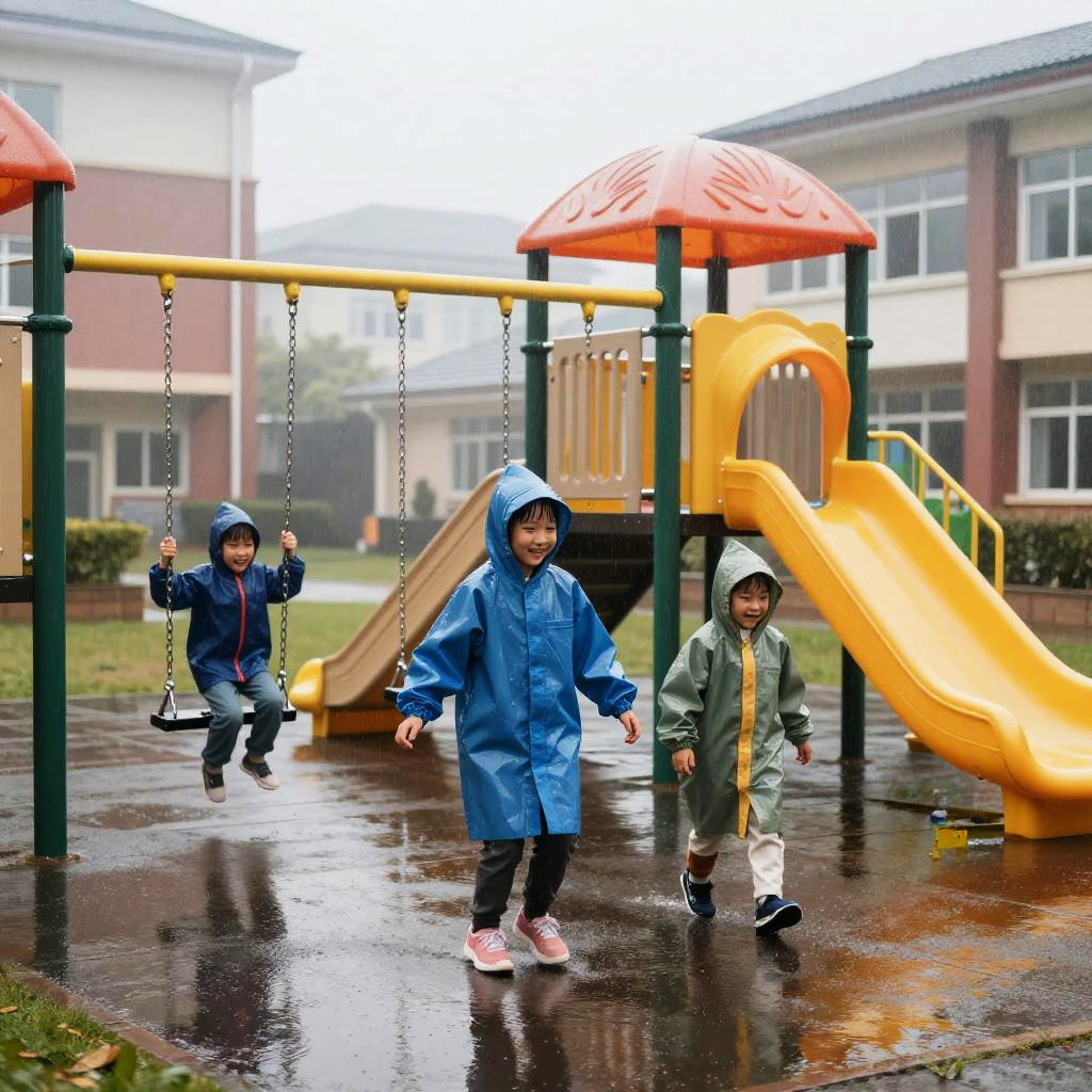 Rainy school day featuring a misty playground with rain-soaked swings and slides, children in rain gear playing happily despite the rain, droplets falling gently, puddles reflecting the gloomy sky and school buildings in the background, soft diffused light