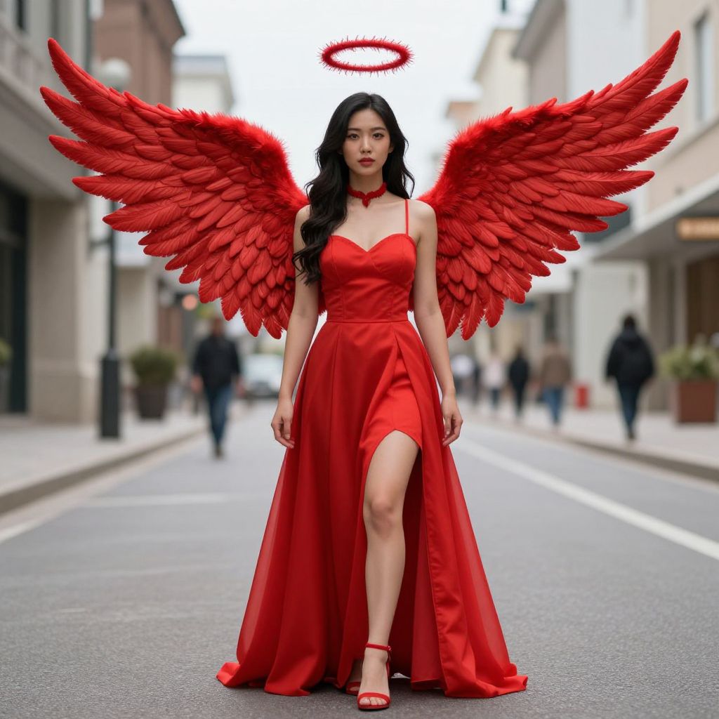 Digital artwork of an Asian woman with red wings, halo, and red dress, striding down a city street, blending angelic and urban elements.