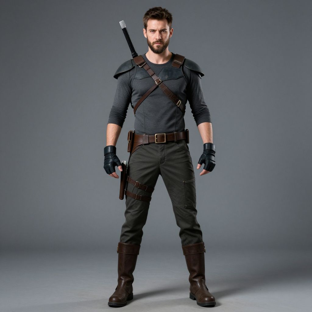 Photograph of a muscular, bearded man with short brown hair, standing against a plain gray background. He wears a tight, dark gray long-sleeve shirt, black pants, and dark brown boots. He has a brown leather strap across his chest with a sheathed sword on his left shoulder and a holstered gun on his right hip. His hands are gloved in black leather, and he stands with a confident, serious expression. The lighting is even, highlighting his strong build and focused demeanor. The overall style is reminiscent of a modern, action-hero character.