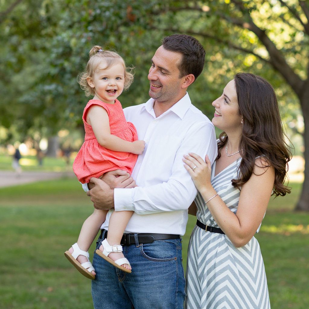 Family portrait captures a joyful moment outdoors, featuring a man in a crisp white shirt and jeans holding a smiling toddler in a vibrant coral dress, while a woman in a stylish gray-and-white chevron dress stands beside them, all set against a lush green park backdrop with trees and sunlight filtering through.