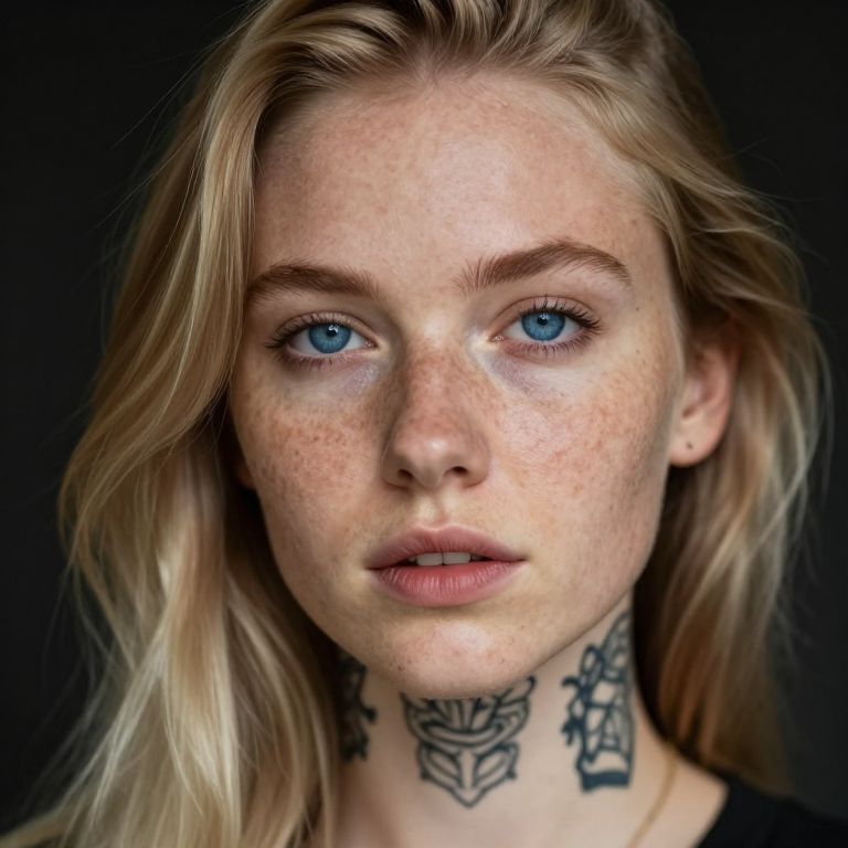 Anti-Aliasing portrait of young nordic girl, age 25, freckled skin, neck tatoo, blue eyes, blond hair, 35mm lens, photography, ultra details,