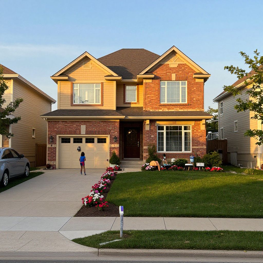 2 story house suburban neighborhood, traditional design with brick and wood facade, driveway with parked car, flower beds lining the walkway, children playing in front yard, late afternoon golden hour lighting, highly detailed and vibrant setting