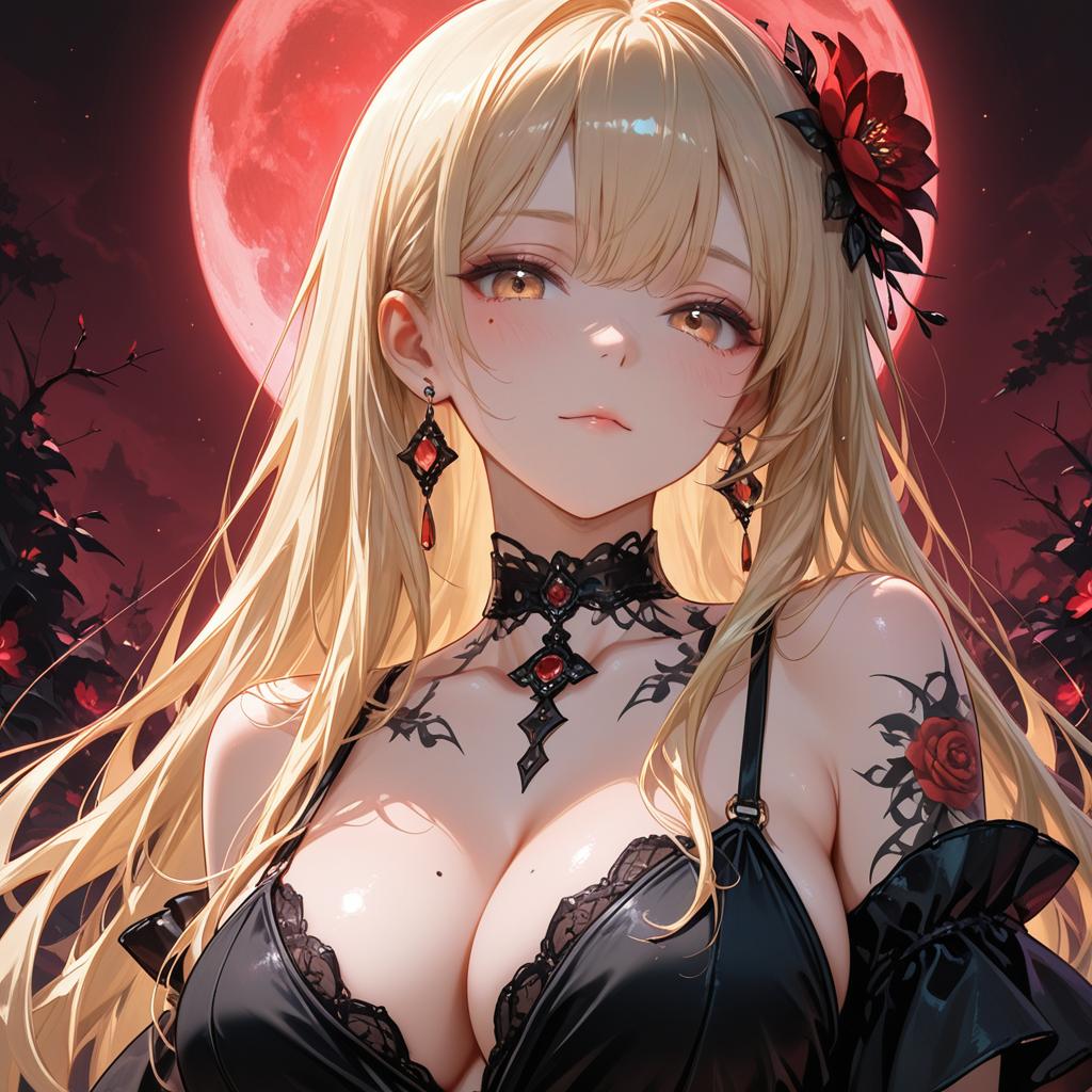 Digital artwork of an anime-style girl with long blonde hair and amber eyes, set against a large red full moon. She wears a black dress with lace details, a matching choker necklace with red gems, black and red rose tattoos on her upper arms and shoulders, and elegant black earrings. Her hair is adorned with a dark red flower and black lace ornament, and she has a small mole on her chest. The scene has a dark, mystical atmosphere with silhouetted branches in the background.