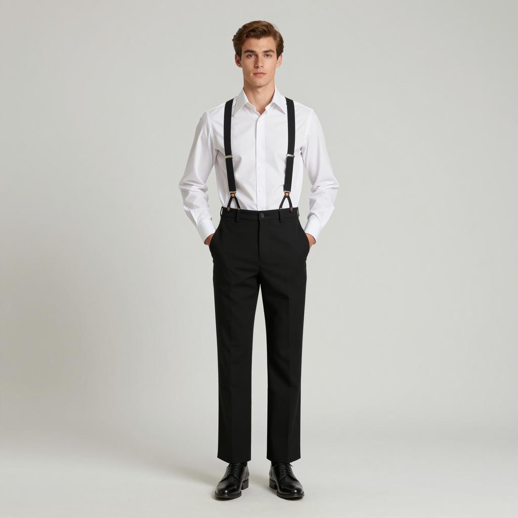 Full body shot of a young white man with neat brown parted hair and a clean face wearing a white slim fit shirt with black suspenders and black trousers. The outfit is styled in a 1970s artist look, evoking a classic, retro fashion aesthetic. The subject stands against a plain light background with hands in his pockets.