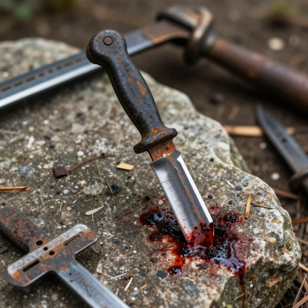 Close-up of a weathered archer's axe with engraved runes, lying on mossy rocks by a misty river, high detail, dramatic lighting