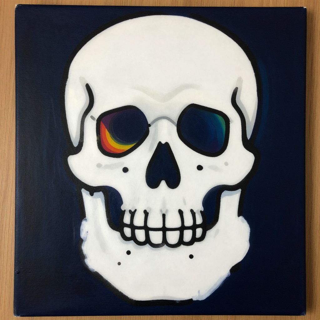 This is a photograph of a painting depicting a white skull with a black background. The skull has hollow eye sockets, with the left eye featuring a colorful rainbow gradient and the right eye solid black. The nose cavity is a simple black triangle, and the teeth are evenly spaced and drawn in black. The skull's outline is slightly irregular, adding a hand-painted feel. The painting is on a square canvas with a visible wooden surface underneath. The overall style is minimalist with a pop of color in the left eye, creating a stark contrast.