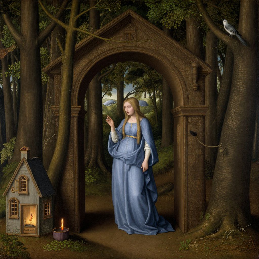 A mystical forest scene with a woman in a forested archway, a small house with a candle, and a bird perched nearby, evoking the style of Cranach.