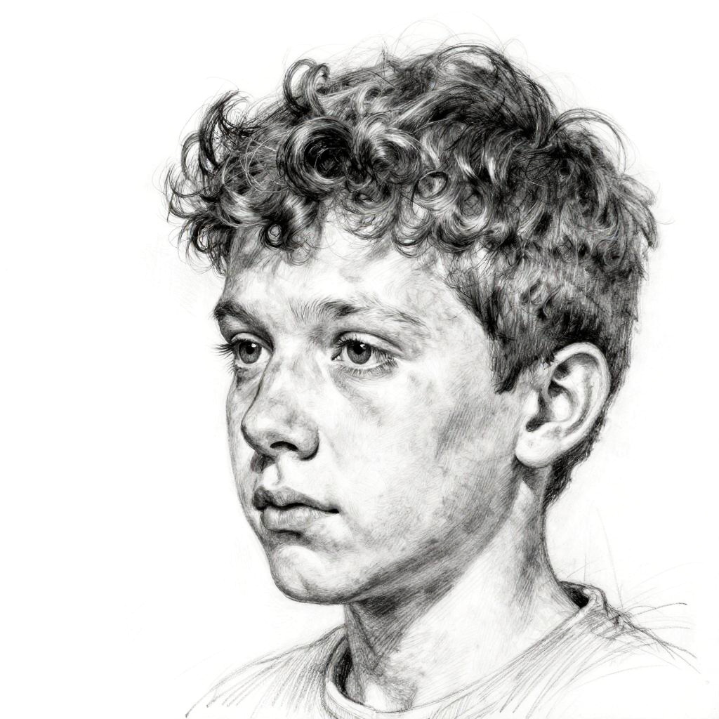 A sketch pencil drawing in black and white of an older boy's face with a curly mop in his dark brown hair. Inspired by Lucian Freud, figurative art, side view. Detailed pencil sketch capturing delicate features and subtle expressions.