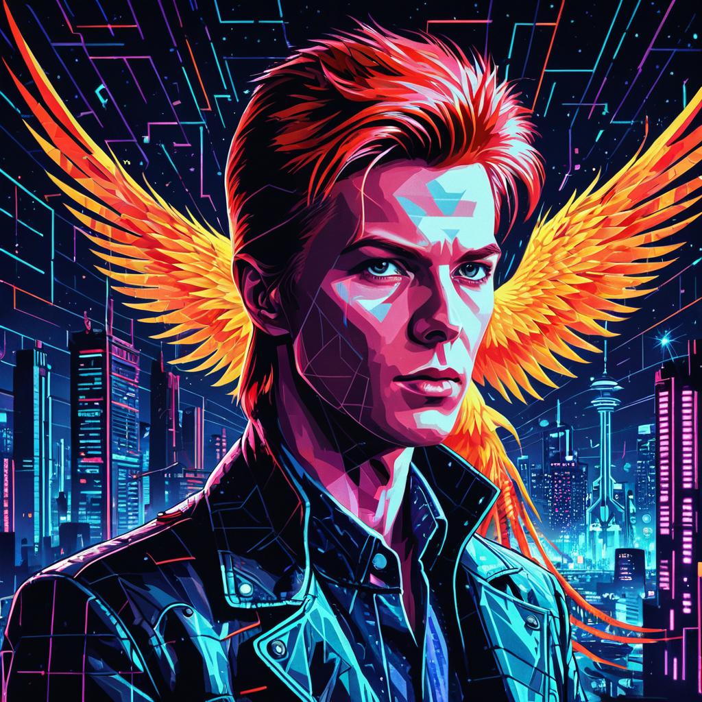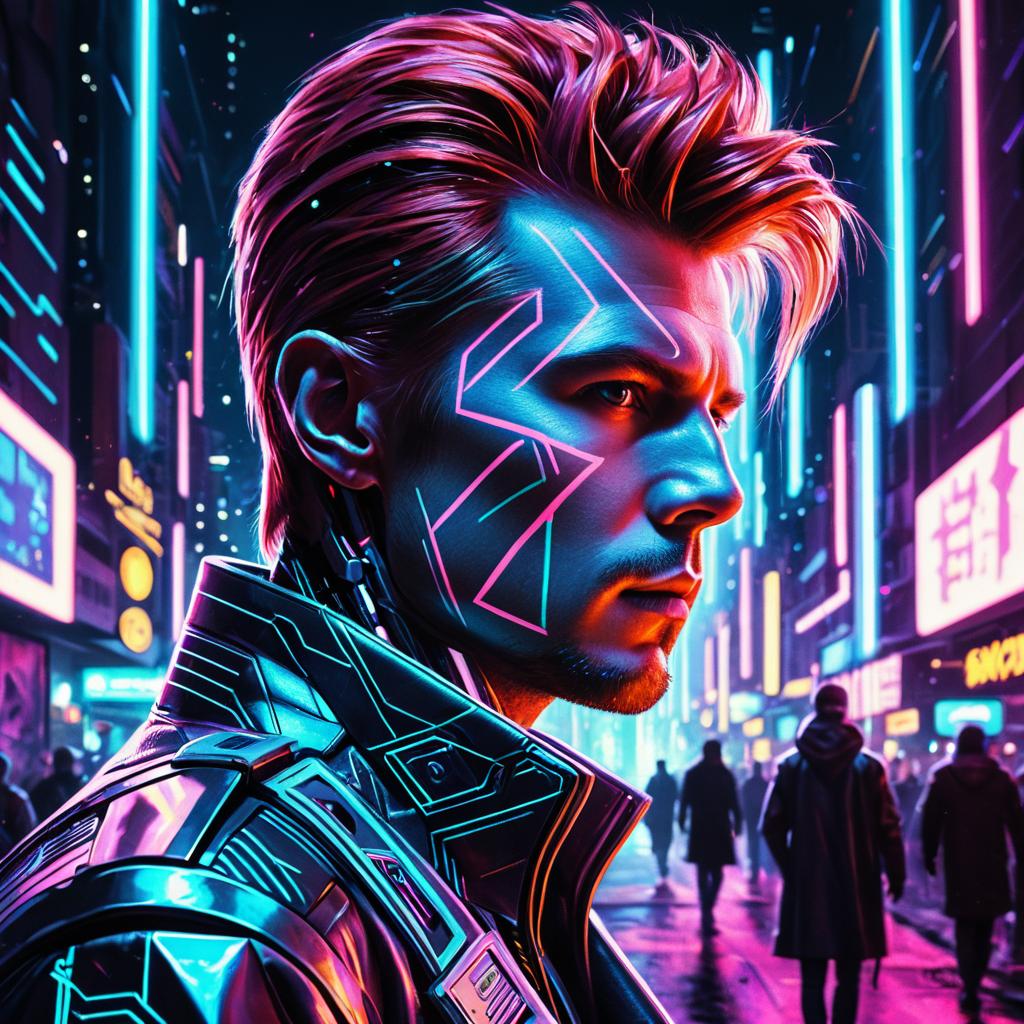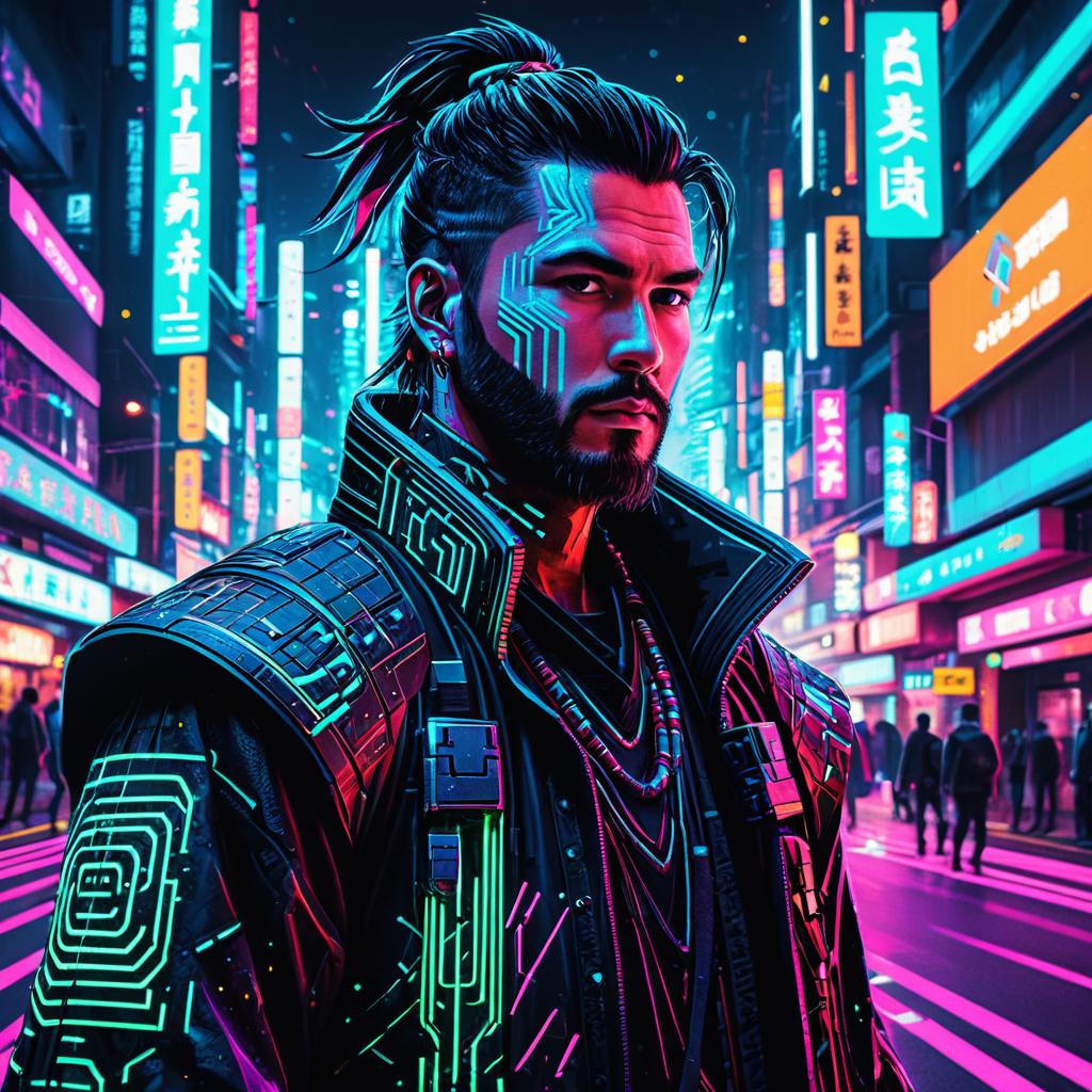 An extremely psychedelic portrait of a neon samurai with cybernetic enhancements in an interstellar glow garden, featuring vibrant glitch art patterns and holo texture overlays, highly detailed digital painting, ArtStation concept art, smooth, sharp focus illustration.