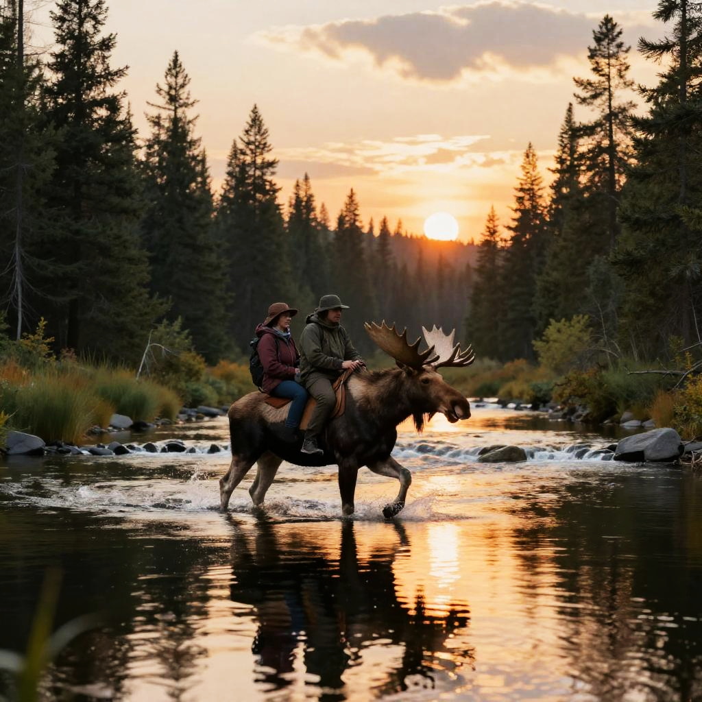 Canadian riding moose carrying adventurers across a serene river at sunset, reflections on water, lush pine trees surrounding, fantasy realism, rich color palette