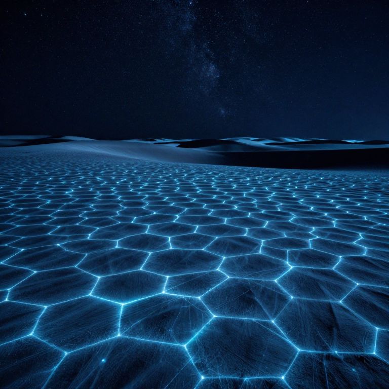 Photograph of a night desert landscape featuring a vast, hexagonal-patterned sand surface illuminated by glowing blue lines, resembling a digital network. The sky above is a deep navy blue, dotted with faint stars. The texture of the sand is visible, with subtle ripples and shadows. The glowing blue hexagons create a futuristic, almost sci-fi aesthetic against the dark, starry background. The image combines natural and digital elements, evoking a sense of otherworldliness. The glowing lines are evenly spaced, forming a continuous, interconnected pattern across the sandy expanse.