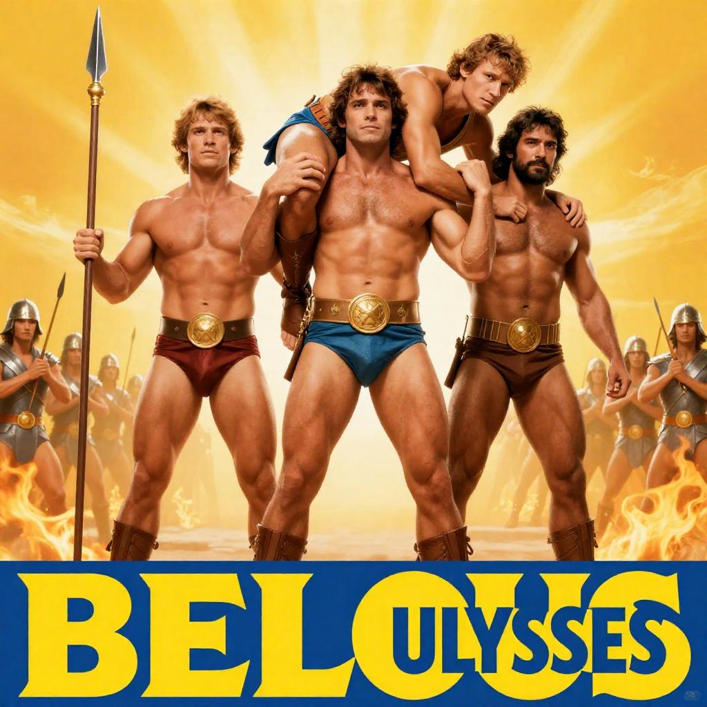 Photograph of three shirtless men in a green-walled room. The man in the center, with short brown hair and a white shirt, is being lifted by the other two, who are muscular and wearing red shorts. The man on the left has dark hair and a beard, while the man on the right is bald. A movie poster for "Rocky Marciano" is in the bottom left corner.