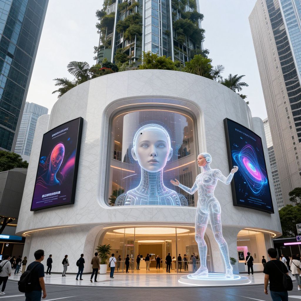 Photograph of a modern urban scene featuring a white, cylindrical building with large, illuminated digital screens displaying neon holographic images. The central screen shows a white, wireframe female face with a calm expression, while another screen to the right depicts a glowing, white, wireframe female figure in a dynamic pose. Flanking the building are tall, glass skyscrapers. The ground level has a white, circular platform with people walking around. The background includes greenery atop the building and a twilight sky. The overall atmosphere is futuristic and bustling.
