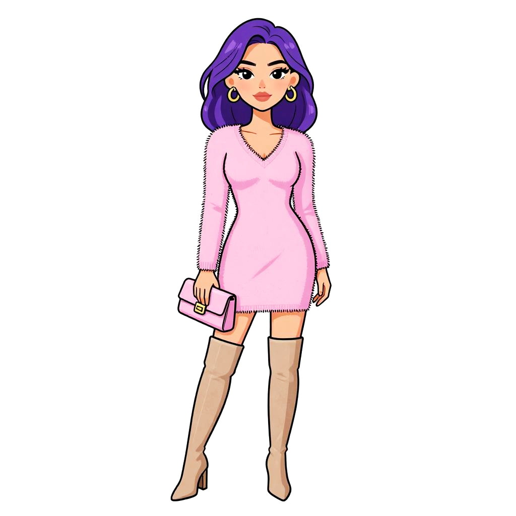 Woman with pretty face and pretty hair. Woman, minimalist chic, fuzzy knit mini dress in pastel pink, V-neckline, long sleeves, thigh-length, matching pink clutch with gold clasp, beige thigh-high suede boots with block heels, white studio background. --sref 1467