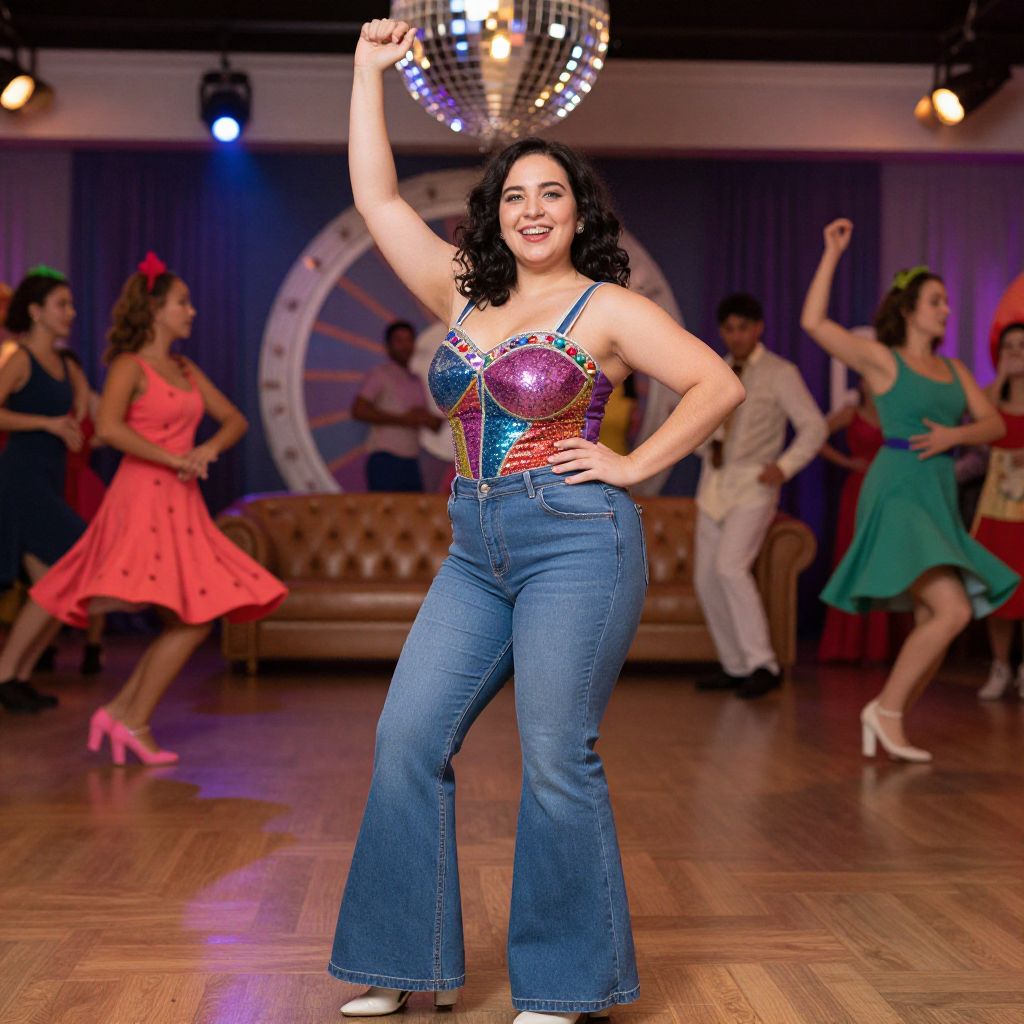 A joyful woman with dark wavy hair and a natural smile, wearing a bold plus size flare jeans costume with a sequined top, standing in a themed ballroom with disco lights and dancers performing, mid-move with one hand raised in celebration.. The woman has big tits and cute face