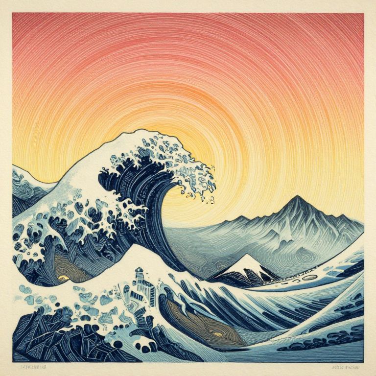 Digital illustration of a stylized, vibrant wave crashing against snow-covered mountains under a red-orange circular sunset sky. Artist: M. D. V.