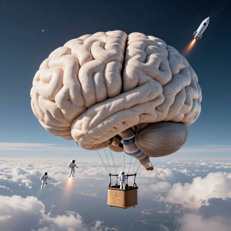 A colossal brain-shaped hot air balloon floats serenely above a sea of clouds, carrying miniature astronauts who stride confidently across its neural pathways while igniting rockets that propel them toward the cosmic expanse.