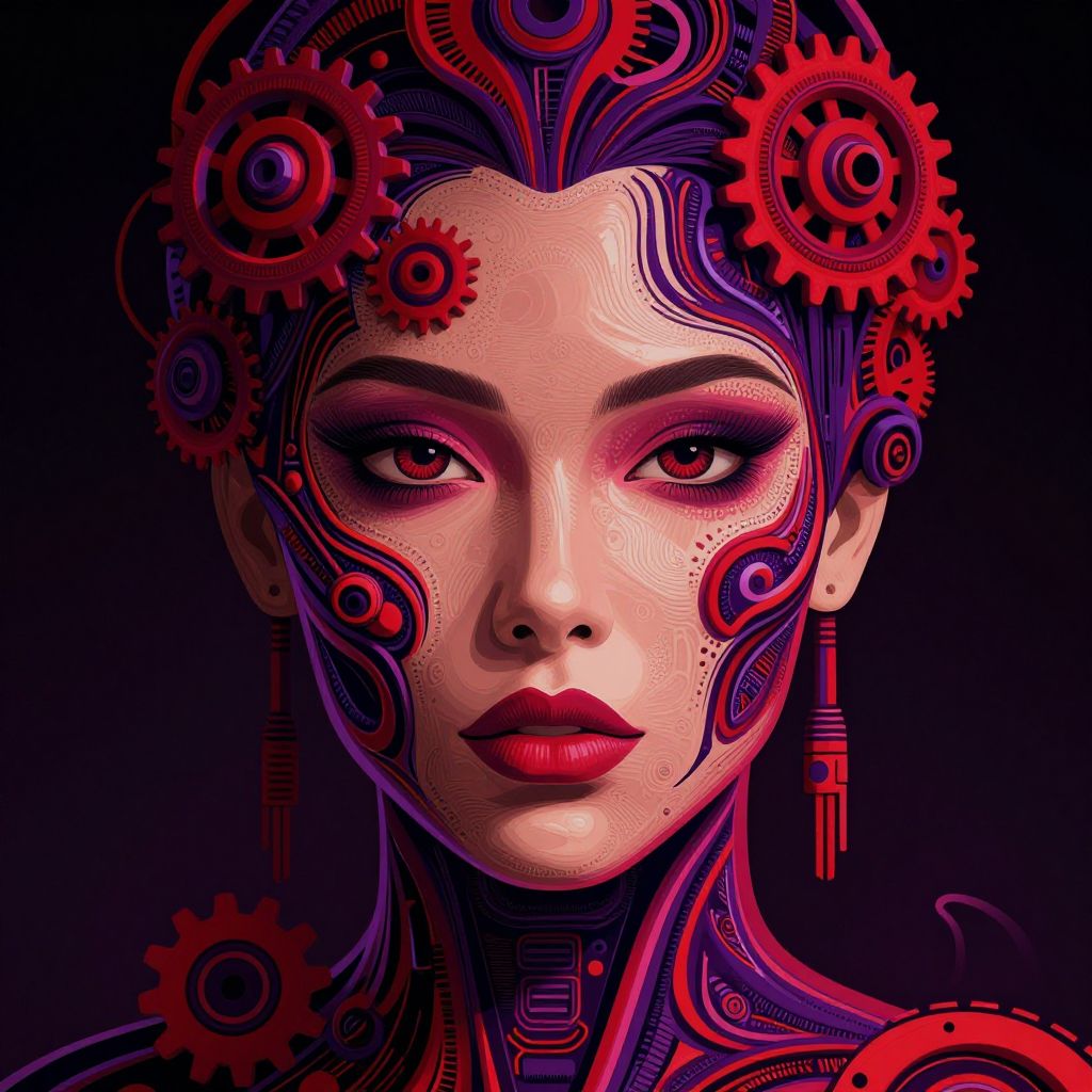 The image depicts a highly detailed, vectorized portrait of a woman with intricate, metallic-like patterns adorning her face and neck. Her hair is styled in elaborate, voluminous curls, cascading down her shoulders. The background is a gradient of dark shades, creating a dramatic contrast with the subject. The overall composition is striking, with the woman's face and the patterns on her skin being the focal points. The texture of the patterns suggests a blend of organic and mechanical elements, adding a futuristic touch to the artwork. The lighting highlights the contours of her face and the intricate details of the patterns, enhancing the three-dimensional effect. The image exudes a sense of elegance and sophistication, with the woman's expression conveying a sense of contemplation or introspection.