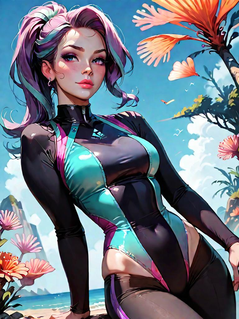 Realistic digital artwork of a young woman with a sleek black spandex long sleeve swimsuit featuring a high neckline and cut-out back. The swimsuit is adorned with shimmering silver sequins and paired with matching fitted shorts. The woman stands on a beach at sunset with the ocean and coral accents in the background, capturing a playful summer vibe.
