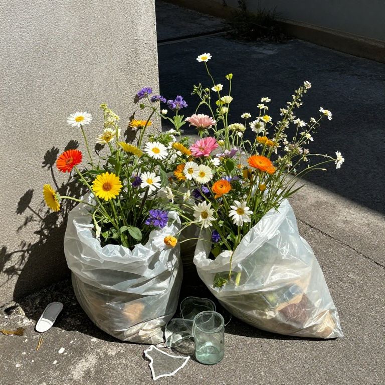 Photograph of two clear plastic bags filled with a colorful mix of fresh flowers, including daisies, gerbera daisies, and wildflowers in red, yellow, white, and purple. The bags are placed on a sunlit, gray concrete sidewalk, casting shadows. A small, empty green glass cup is in front of the bags, and a white plastic cap lies nearby. The background features a white, textured wall. The bright sunlight creates contrasting shadows and highlights the vibrant colors of the flowers.