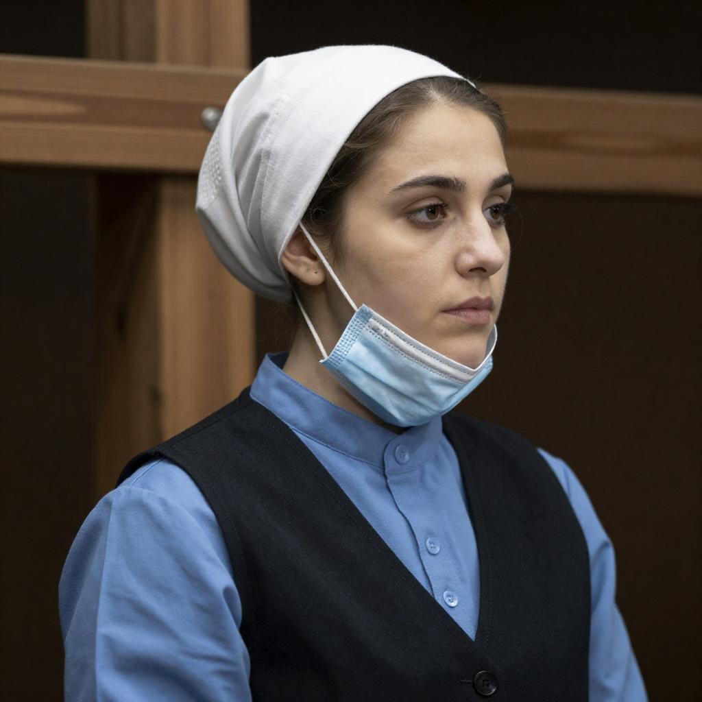 Photograph of a woman with light skin and brown hair in a white headscarf, wearing a blue shirt and black vest, with a surgical mask hanging around her neck. She has a focused expression. Wooden beams and a dark background are in the background. She is positioned slightly to the right, facing left.