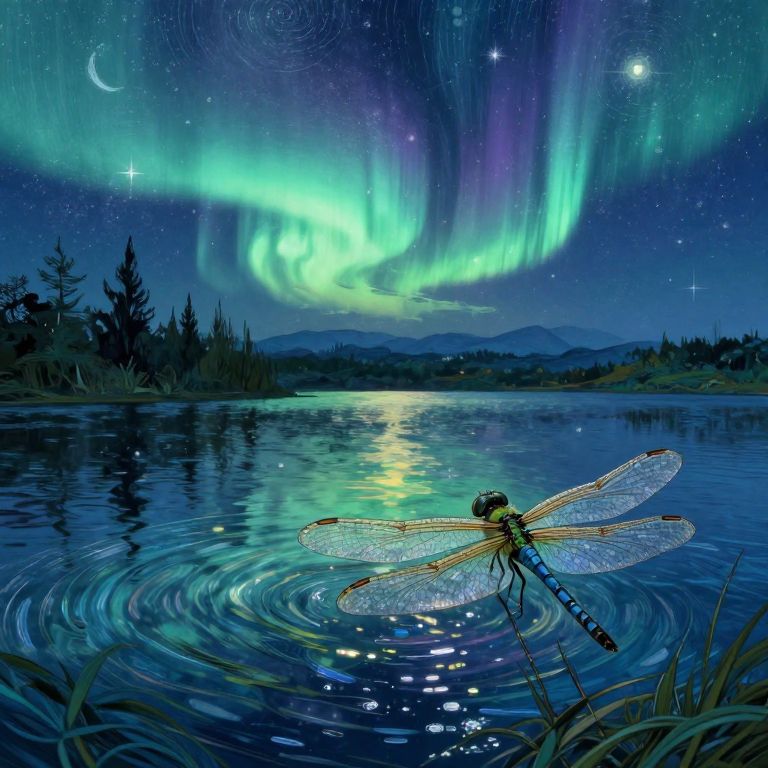 Digital illustration depicting a serene night scene with a vibrant northern lights display in the sky. A detailed dragonfly with translucent, iridescent wings and a slender black body emerges from rippling water in the foreground. The background features a star-studded sky with a crescent moon, silhouetted pine trees, and distant mountains. The water reflects the colorful aurora, creating a magical atmosphere. Grasses are visible in the bottom right corner, adding texture to the scene. The overall color palette includes deep blues, greens, purples, and yellows.